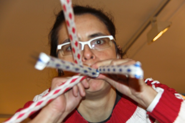 Suena una banda sonora formada por diferentes ladridos de perro distorsionados. Se proyecta sobre la performer un fondo azul. La performer está sentada en una mesa con un cordero de peluche sujeto a la cabeza, un micrófono y un maletín. Delante de ella hay 30 cestas de la ropa rectangulares alineadas en 6 líneas de 5 cestas separadas un palmo entre sí. Pegada a la mesa hay una cruz de pellas de barro rodeada de 10 cirios rojos encendidos. En la mesa hay un grupo de folios en blanco que la performer observa. Se acerca al micrófono varias veces y pasa las hojas. En un momento dado se mete uno de los folios en la boca, lo mastica hasta hacer una bola compacta y la escupe hacia las cestas. Coge otra hoja y repite el proceso varias veces. Algunas caen dentro, otras caen fuera. Entonces, la performer abre un maletín y saca un machete de carnicero, se levanta y se posiciona frente a la cruz, apaga todos los cirios y con golpes secos la convierte en fragmentos del tamaño de un puño con los que hace una pequeña montaña. Tras esto, va dando a cada uno de los asistentes un trozo de barro que ellos transforman o no. Algunos espontáneamente los depositan en las cestas.